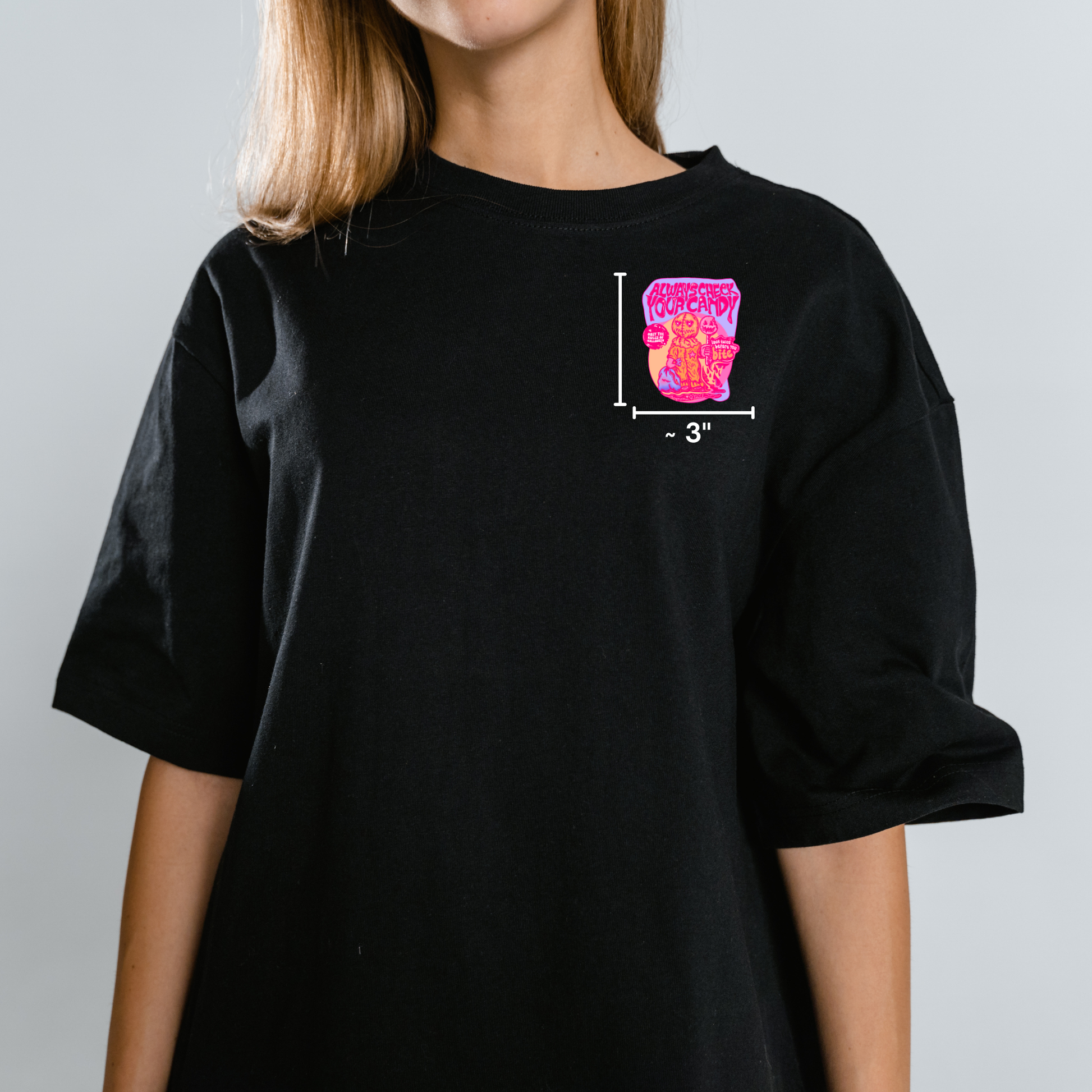 Celebrate the golden rule of spooky season with our Sam from Trick ’r Treat design — featuring the mischievous pumpkin-headed enforcer himself surrounded by chilling reminders to “Always Check Your Candy.” A distressed circular “sticker” beside him reads “Obey the Rules of Halloween,” while the warning “Look Twice Before You Bite”drips in blood-red lettering on the other side.