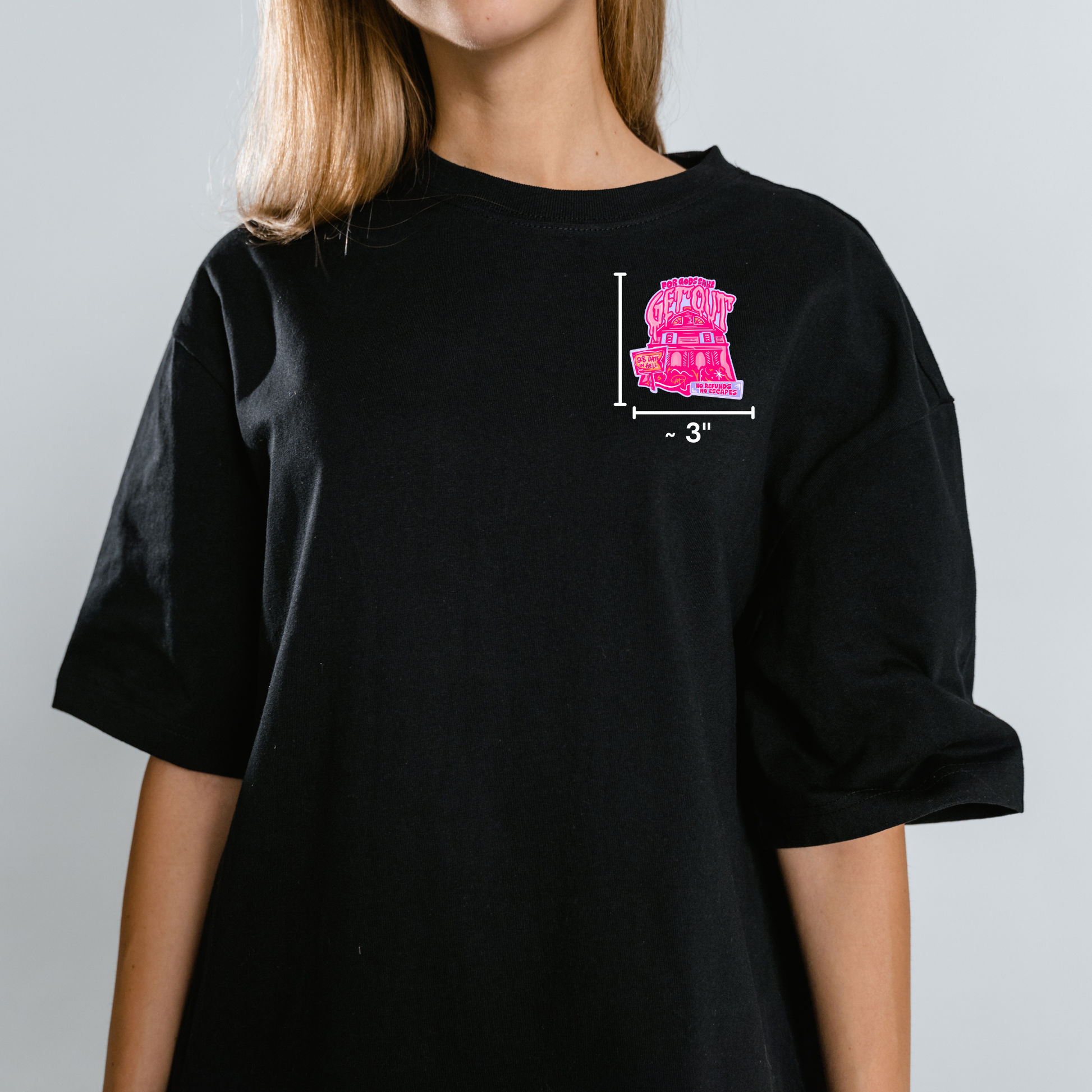 Step inside (if you dare) with our Amityville Horror House design — featuring the infamous haunted home framed by the chilling words “For God’s Sake, Get Out” in bloody red text. A weathered sign in the front yard reads “28 Days in Hell,” marking one of horror history’s most cursed stays. Perfect for horror buffs, retro movie lovers, and fans of tongue-in-cheek terror.