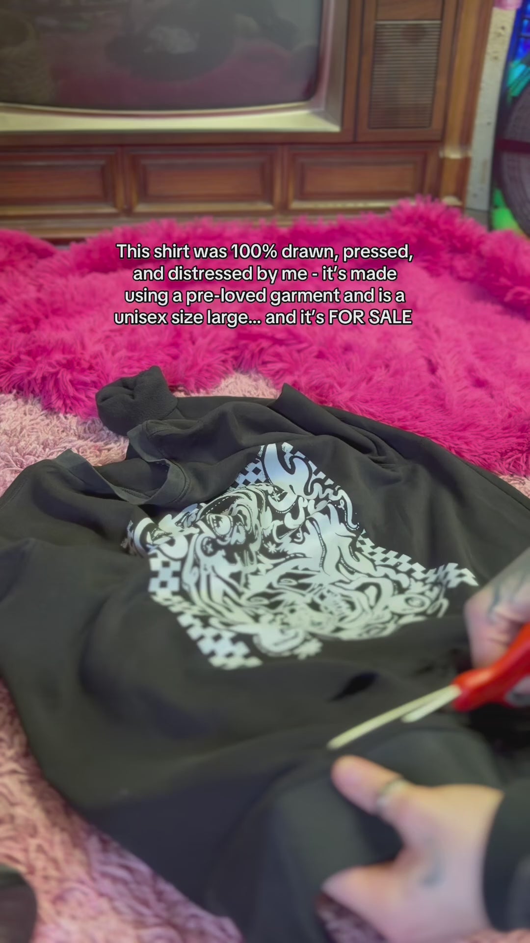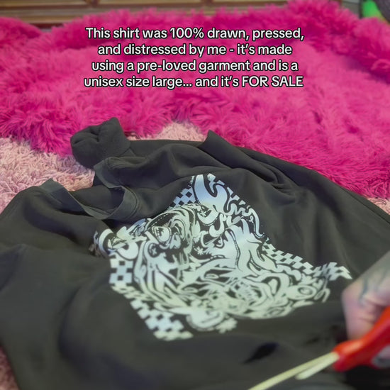 Designed and drawn by Madam Radical (me) in Procreate, and printed locally at Sonic Bark Vinyl as a DTF transfer. It is then pressed in my garage, and distressed manually by me.